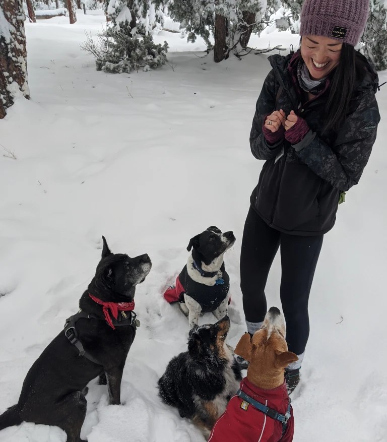 Jenni (she/her/hers) is a Fear Free Certified trainer with a BA in Psychology. Jenni became passionate about dog training after hiring and firing trainers while in search of help with her own dog. She focuses on strengthening the human-canine bond, and making training as fun as possible for dogs and their people. Jenni particularly enjoys helping fearful and reactive dogs, has completed Michael Shikashio’s Aggression in Dogs Master Course, Dr. Susan Friedman’s Living and Learning with Animals, and spent time with the ASPCA behavioral rehabilitation team working with severely fearful dogs. Jenni is a student in the Virginia Tech MS in Applied Animal Behavior and Welfare Program. She lives in the Colorado mountains with her husband, Tim, their border collies, Ky and Rocket, and two kitties, Marmalade and Truffle.